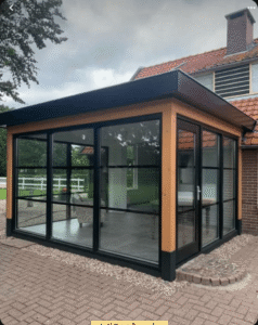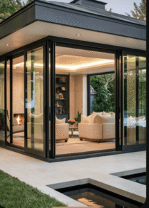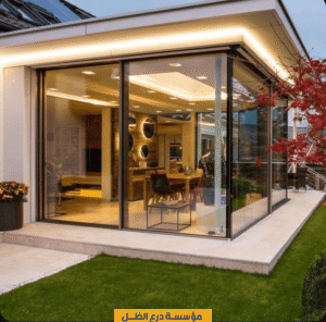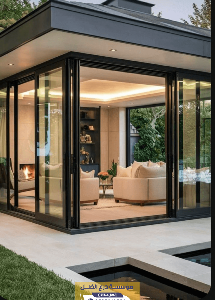 يعتمد على واجهات زجاجية كبيرة تسمح بمرور الضوء الطبيعي وتكشف جمال الحديقة. مثالي ليكون غرفة معيشة نهارية أو مرسماً فنياً.